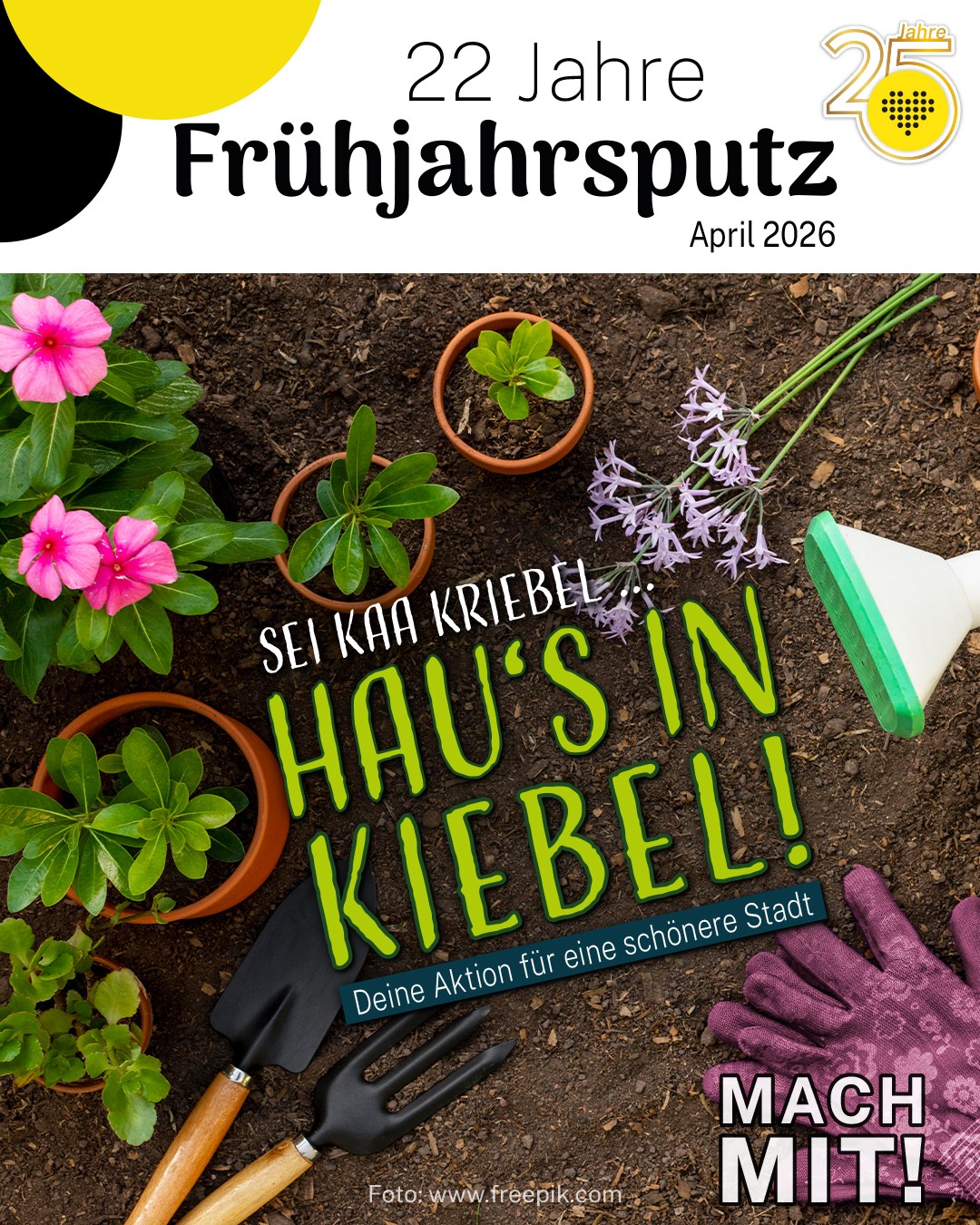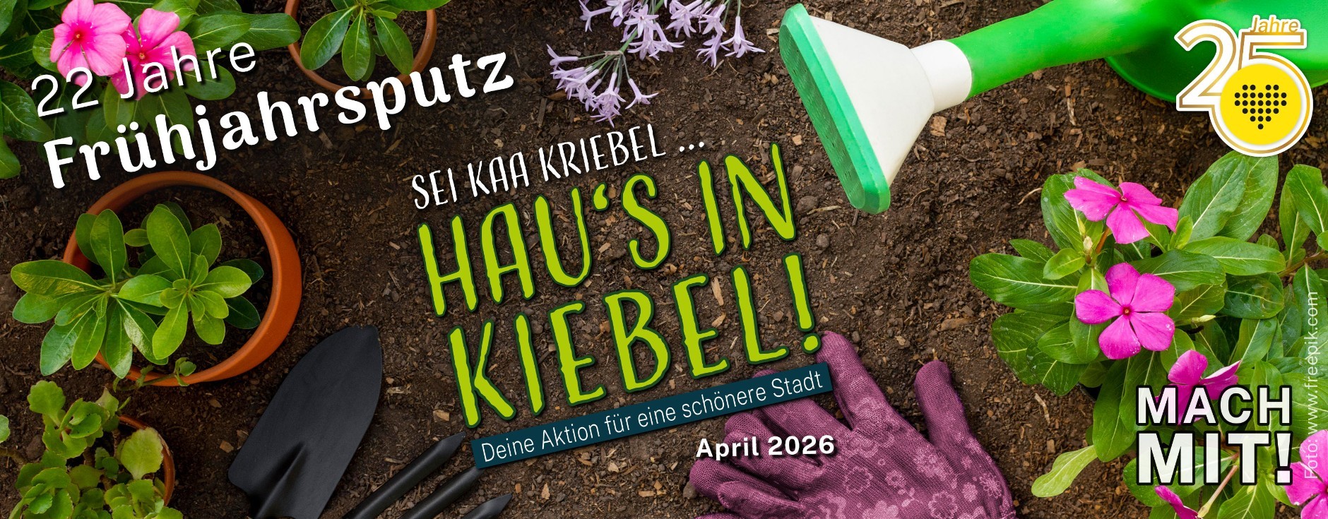 Bereits zum 22. Mal laden wir als Dachverband Stadtmarketing Plauen e. V. zum traditionellen Plauener Frühjahrsputz ein. Der gesamte Monat April steht auch in diesem Jahr unter dem Motto "Sei kaa Kriebel, hau’s in Kiebel!" Das beliebte Mitmachevent richtet sich an alle Plauener und Plauenerinnen, Vereine und Institutionen, sich mit Gemeinschafts- sowie kreativen Einzelaktionen am Plauener Frühjahrsputz zu beteiligen. Neben den klassischen Müllsammelaktionen sind auch kreative Beiträge zur Stadtverschönerung herzlich willkommen. Setzt gemeinsam mit Nachbarn oder Freunden farbenfrohe Akzente und pflanzen Blumen oder pflegen Beete. Die Aktion läuft bis einschließlich 30. April 2026. Sendet uns eure Vorher-Nachher-Aufnahmen an info@stadtmarketing-plauen oder markiert uns direkt in euren Social-Media-Beiträgen (Instagram: @stadtmarketing_plauen | Facebook: