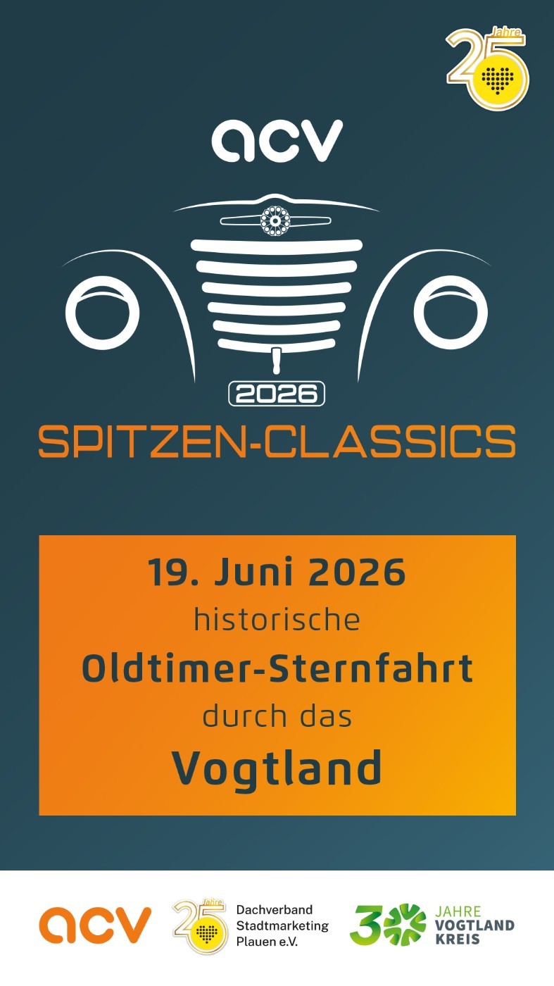 Anlässlich des Jubiläums 30 Jahre Vogtlandkreis und 25 Jahre Dachverband Stadtmarketing Plauen e.V. planen wir gemeinsam mit unseren Partnern ACV OC Plauen e.V. und dem Framo Ausstatter (Inh. Jens Scheunert) ein ganz besonderes Highlight: Am 19. Juni 2026 findet die erste SPITZEN-CLASSICS – Oldtimer-Sternfahrt statt. Von verschiedenen Startpunkten aus führen die Routen sternförmig durch unsere Heimat. Im Mittelpunkt steht ihr – und eure automobilen Schmuckstücke. Gemeinsam fahren wir quer durch das Vogtland, begegnen Menschen entlang der Strecke und bringen klassische Mobilität direkt in die Orte und Gemeinden unserer Region. Anmeldung: Anmeldung ACV … Weitere Informationen: stadtmarketing-plauen.de/spitzen-classics/