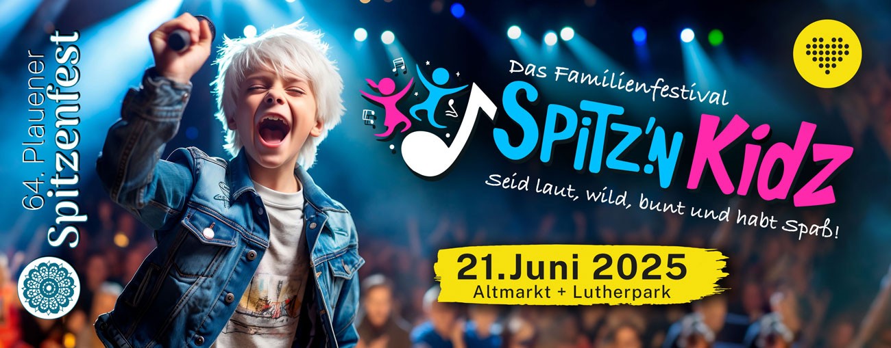 Super-Party! Riesenfest! Zum ersten Mal so groß und nur für euch: Pünktlich am 21. Juni verwandelt sich die Plauener Innenstadt in das sicher größte und schönste Kinder- und Familienfestival der Region – das „Spitz’nKidz“! Mittagsschlaf fällt diesmal aus, denn das solltet ihr auf keinen Fall verpassen: Auf euch warten über 40 echt tolle Attraktionen zum Toben, Tanzen, Zocken, Rocken, Knuddeln, Staunen und Schreien (vor Freude natürlich).